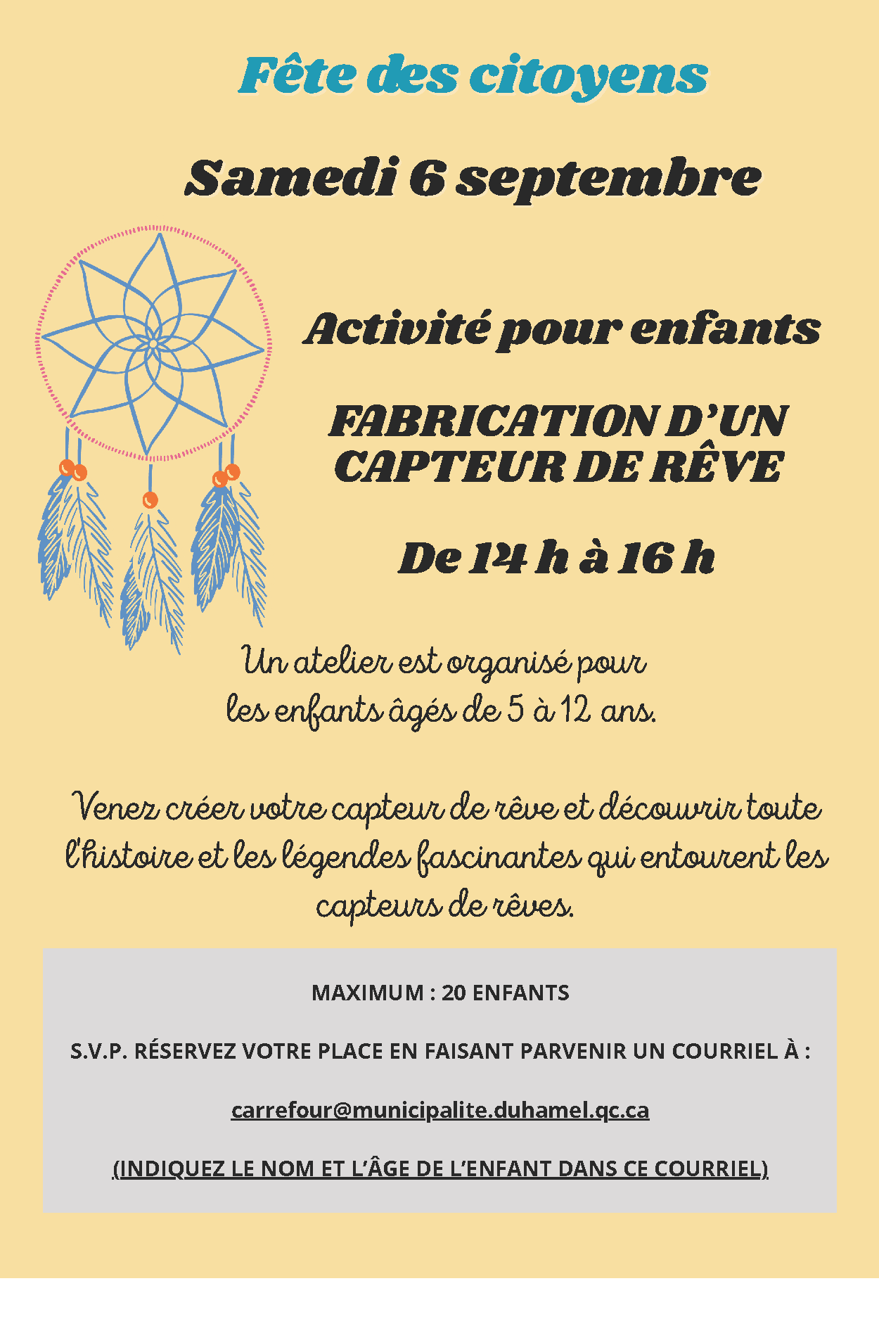 Réservez votre place en faisant parvenir le nom et l'âge de l'enfant à : carrefour@municipalite.duhamel.qc.ca