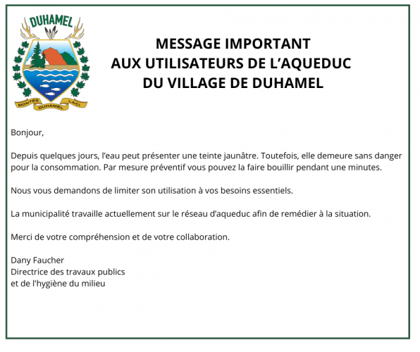 Aux utilisateurs de l'aqueduc du village de Duhamel